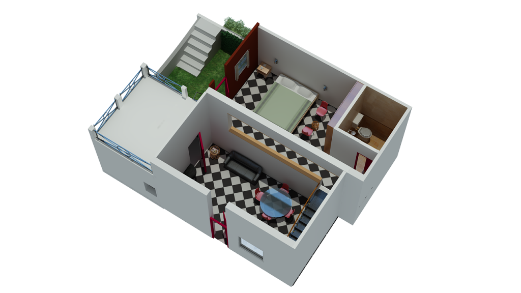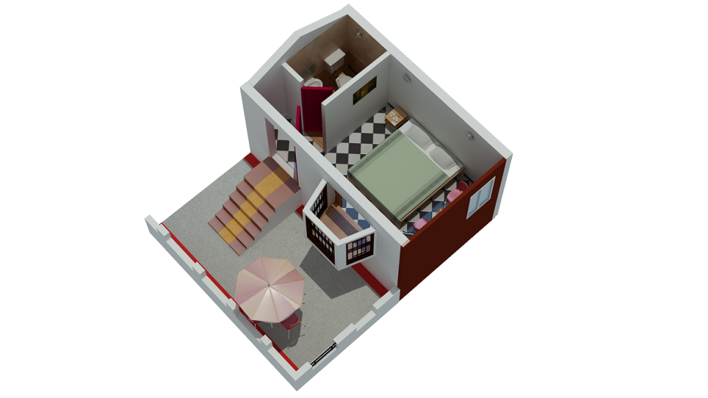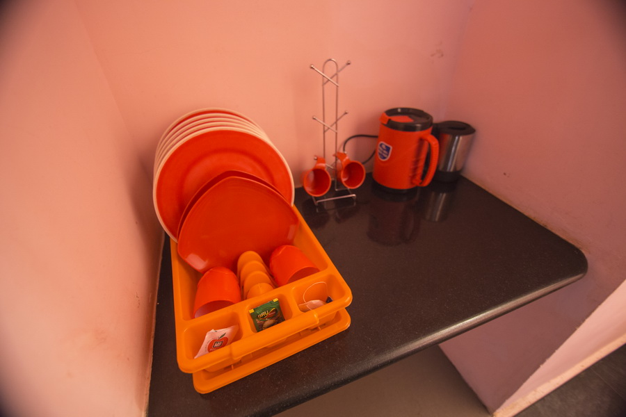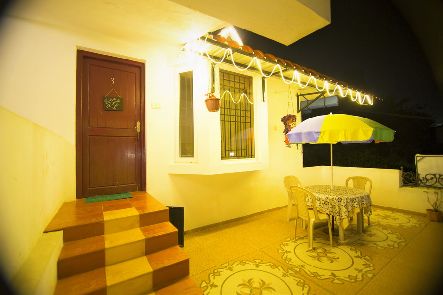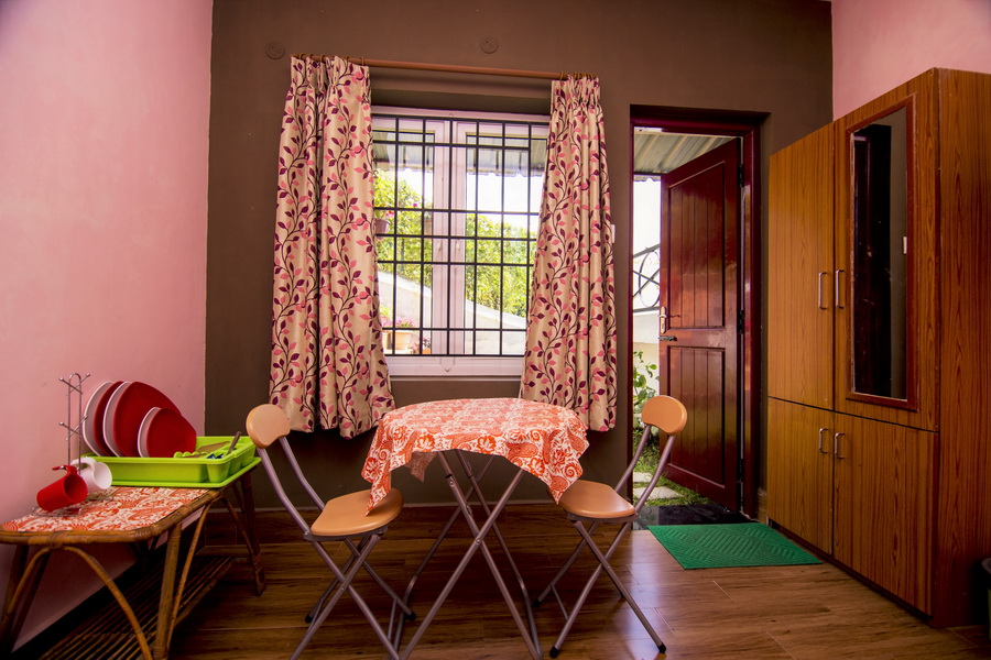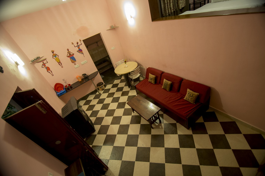 The Unit consists of a living cum dining at the ground level and a internal stairs take you to the bedroom & bath/toilet at the mezzanine level. The far side of the mezzanine opens to a small lawn and a sit out thereof. There is small kitchenette attached to the living cum dining but cooking is restricted. The living is furnished with sofa cum bed and a dining table and a TV.